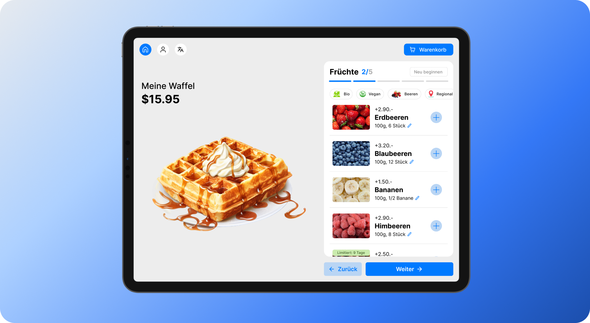 Das Ziel war es, eine benutzerfreundliche App zu gestalten, mit der man sich seine eigene Waffel zusammenstellen oder eine vorgefertigte auswählen kann. Der Fokus lag auf dem Aufbau eines Konfigurators, der sowohl funktional als auch intuitiv ist.